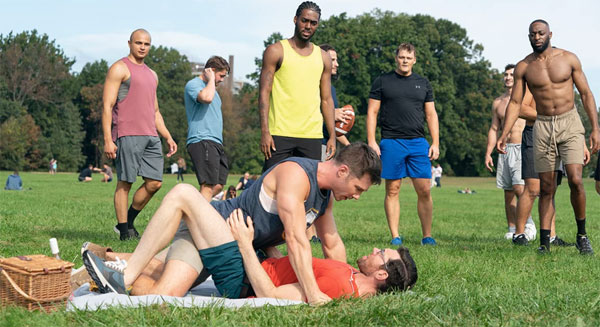 This tiny interaction, where Bobby (Eichner) and his new boyfriend Aaron (Luke McFarlane) lie in bed and discuss Bobby’s chest — Aaron describes it as looking “like a birdbath” — is so out of sync with the face-punching hyperactivity and aggressive hard sell of the rest of the film, it feels as if we’ve entered a new reality. For thirty seconds we can calmly see what “Bros” might’ve been had the entire production not been shot with a tanker truck full of epinephrine. The film is being sold as a Rom/Com but there is no Com to be found. And though the script has its share of ostensibly funny lines, the actors have been directed to lean so hard into the ‘jokes’ they end up alchemically transmuting the film into a Dada-esque landscape of anti-humor. Not helping matters is the charmless black hole of Billy Eichner, who cavalierly sucks all the light off the screen every time he opens his mouth. Randomly switch-hitting from a grab bag of repellent acting choices: shrill, mawkish, caustic, irritating and smarmy — apparently meant to represent his gay-specific neuroses — Eichner proves that simply being the star of a movie doesn’t mean you’re a movie star. McFarlane does better in his laughably underwritten part of a Lawyer who dreams of being a chocolatier (no kidding). But even Daniel Day Lewis couldn’t make this role (or the relationship) believable: Bobby and Aaron are not people — they are constructs. Like the generic food packaging in Alex Cox’s “Repo Man” (1984), they should just wear white t-shirts with blue lettering that read “gay-body-builder” and “gay-irritant.”