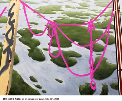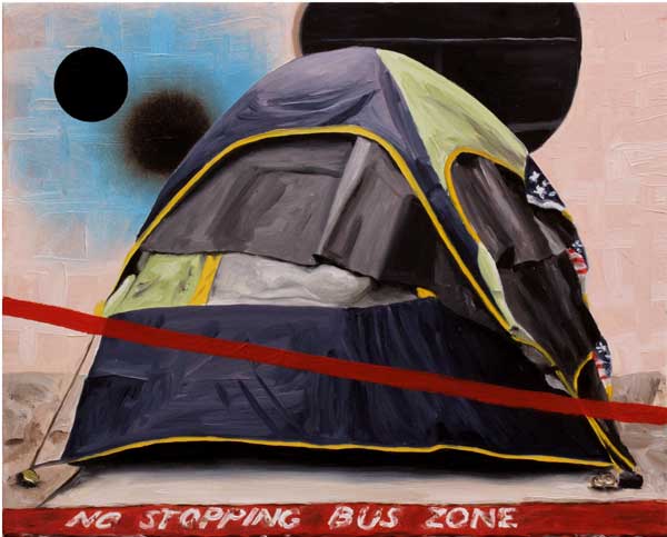 Critics often decry the lack of relevancy in art. I am not aware of an artist focused on homeless tents. Your painting may be the most relevant image of our modern times. Lisa Adams: Hundreds of tents and other makeshift shelters sprinkled throughout the city and surrounding areas have to be an indication of something, doesn’t it? It’s a decline of sorts, a shift for certain, but mostly I think of this condition as a reminder, a checkpoint between point A and point B, causing one to wake up and be grateful you’re not on the streets for now. GG: There is a great sense of humor in this work. LA: I wouldn’t say there is a sense of humor in this work. It’s more an embellishment of reality. Reality with a bit of aesthetic and contextual primping. The black circles in the background are like planets, dark moons or portals, a little like X-Files. I think there is a sense of otherworldliness, which is how I always feel when I see lots of tents lined up along a street.