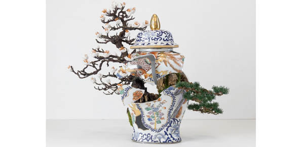 Gravity-Defying Sculptures Shatter Traditional Notions of Pottery; Inspired by the Dutch tradition of Delft blue pottery that imitated Chinese porcelain, Patrick Bergsma incorporates handcrafted bonsai trees into his exploding works